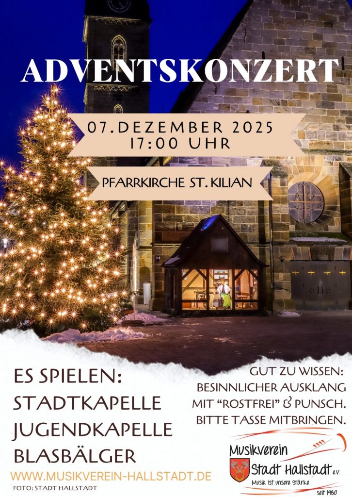 Der Musikverein Hallstadt e.V. lädt herzlich zum diesjährigen Adventskonzert amSamstag, den 7. Dezember 2025, um 17:00 Uhr in der Pfarrkirche St. Kilian ein. Freuen Sie